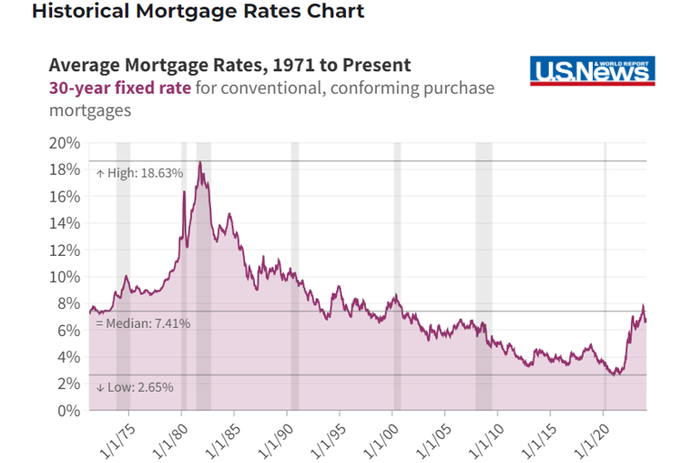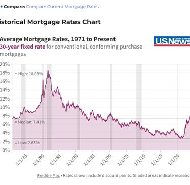 Most so called "experts" state that a real estate recovery is dependent upon lower mortgage rates. However, I say that PRICES need to come down (lower rates will just result in higher prices). As of January 2026, the current 30 year mortgage rate is hovering just above 6%. Everyone is in shock because rates were under 3% four years ago. However, historical rates were 8% for many years, Todays 6% rates are actually low compared to historical 8% rates of the 1970's and 1980's.